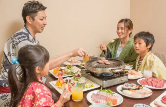 夕食バイキングだけでなく卓球(30分無料)、カラオケルーム(60分無料)、キッズルーム、マッサージ機、大浴場、貸切家族風呂もご利用いただけるお得なプランとなっております。※お食事席はご宿泊のお客様優先となりますので、ご利用いただけない日程もございます。